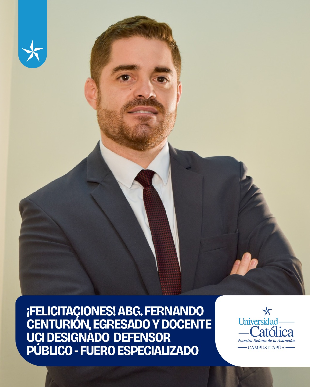 La Universidad Católica “Nuestra Señora de la Asunción” – Campus Itapúa celebra con orgullo la designación del Abg. Fernando Centurión, egresado y docente de la Carrera de Derecho de la Facultad de Ciencias Jurídicas, como Defensor Público del Fuero Especializado en la Ley N° 5777/16, de Protección Integral a las Mujeres contra toda forma de violencia.