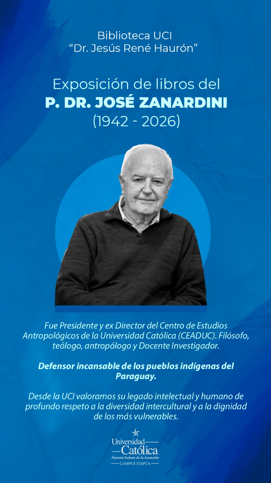 La Universidad Católica “Nuestra Señora de la Asunción” – Campus Itapúa, a través de la Biblioteca “Dr. Jesús René Haurón”, realiza una exposición de libros en memoria del P. Dr. José Zanardini, destacado ingeniero, filósofo, teólogo y antropólogo, fallecido el 19 de enero de 2026, cuyo legado marcó profundamente la historia cultural, social y educativa del Paraguay.
