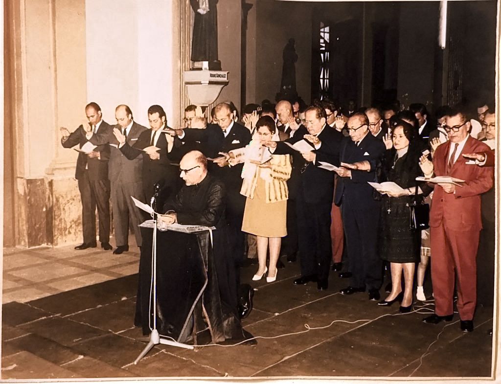Año 1960. Monseñor Juan Moleón Andreu jurando como Primer rector de la Universidad Católica junto con todo el equipo directivo y primeros docentes de la UC.