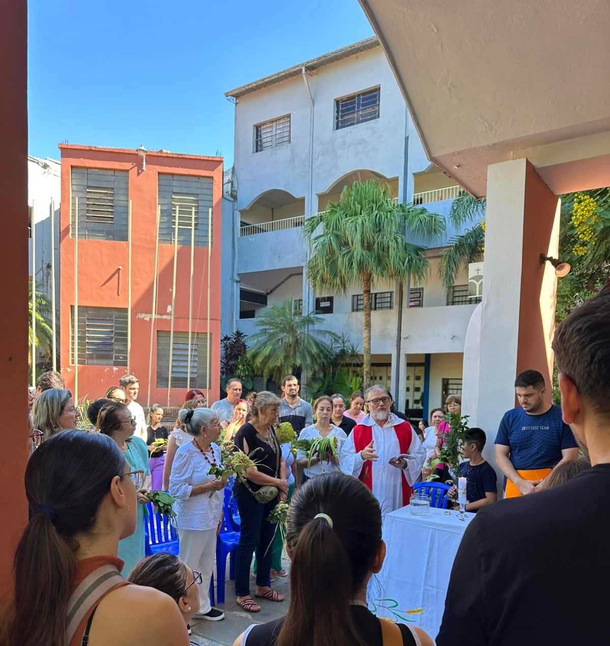 La celebración se llevó a cabo el domingo 29 de marzo, fue oficiada por el P. Silverio Britos e inició con la tradicional bendición de ramos en la explanada de la institución, recordando la entrada triunfal de Jesús en Jerusalén, acontecimiento que marca el comienzo del camino hacia la Pasión, Muerte y Resurrección de Cristo.
