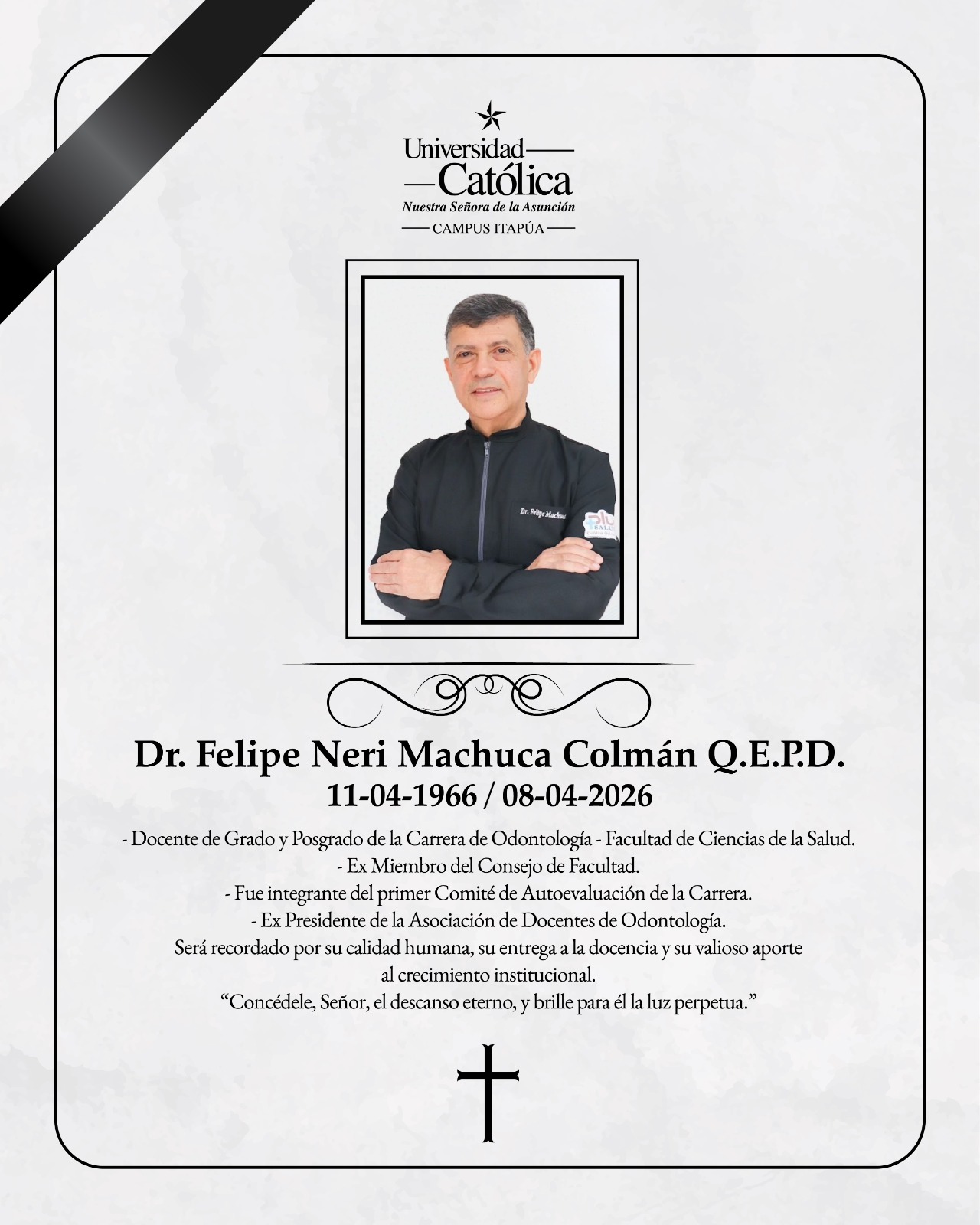 La Universidad Católica “Nuestra Señora de la Asunción”, Campus Itapúa, participa con profundo pesar el fallecimiento del Dr. Felipe Neri Machuca Colmán, destacado docente y apreciado miembro de nuestra comunidad académica.