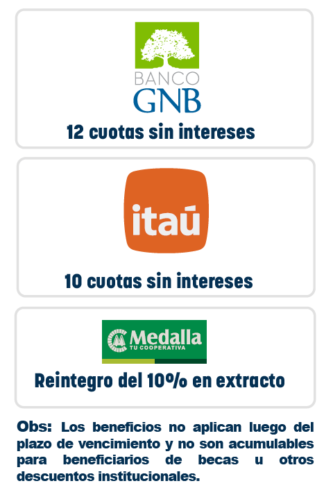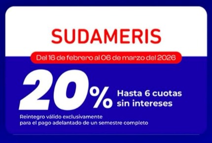 Hasta 6 cuotas sin intereses. Reintegro válido exclusivamente para el pago adelantado de un semestre completo para carreras de grado. Monto mínimo de pago para que aplique el reintegro: