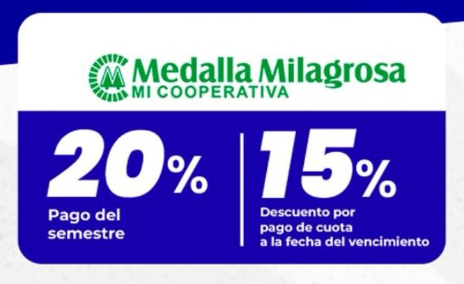 20% Pago del Semestre y 15% de descuento por pago de cuota a la fecha del vencimiento.