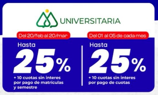 Hasta 25%: Del 20 de febrero hasta el 20 de marzo - Para pagos de matrícula y pagos por el semestre.