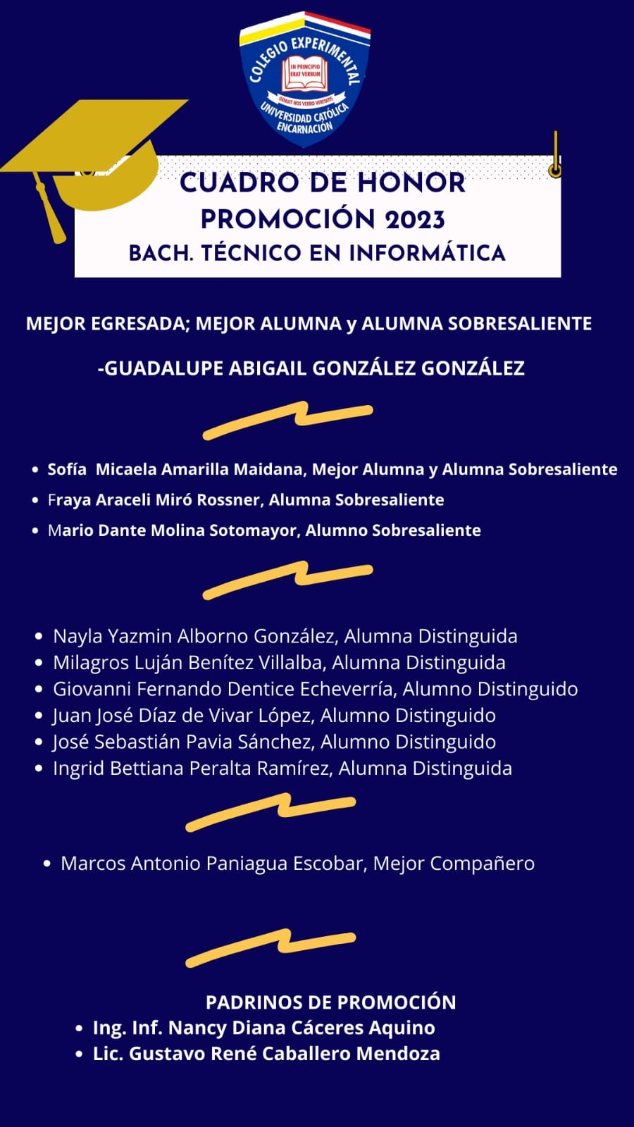 “Una vida escolar que termina es sólo una página más que llega a su fin, la historia continúa, hay más peldaños que subir” versaba en parte de la invitación de la Dirección y los egresados. “Que cada paso que den de ahora en adelante, esté marcado por las huellas del éxito. Muchas Felicidades por el esfuerzo y el logro obtenido!” expresaba la publicación del cuadro de honor, cuya nómina de egresados es como sigue: