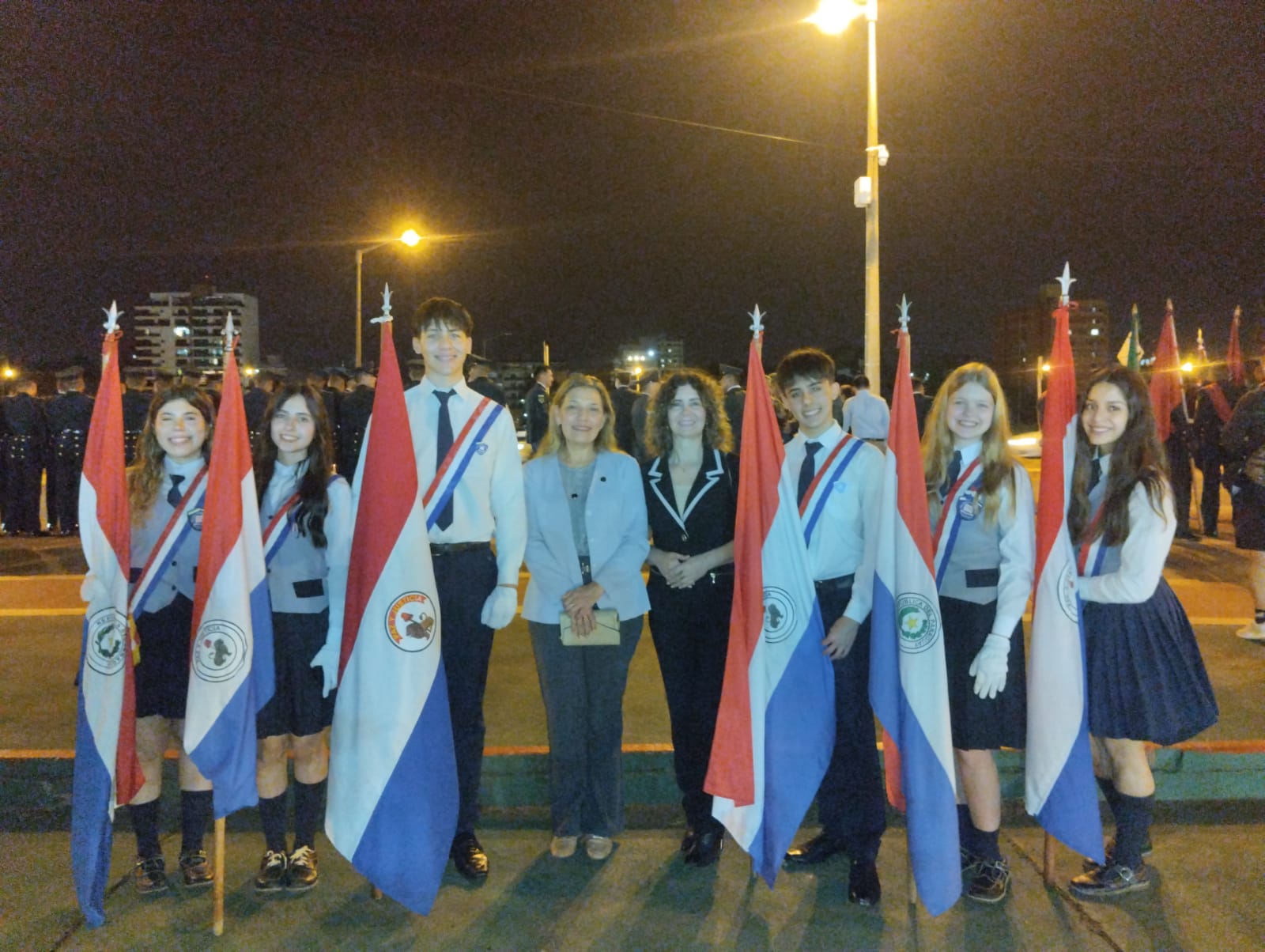 La Dra. María Elena Villalba Díaz, Directora General de la UC Itapúa, representó institucionalmente a la Universidad, acompañada por los abanderados del CEUCE, quienes con solemnidad portaron los emblemas patrios en esta significativa jornada de recordación.