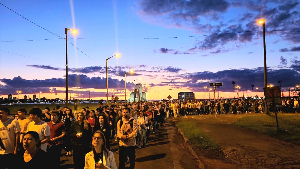 La caminata de fe se realizó el jueves 30 de octubre, congregando a estudiantes, docentes, directivos y funcionarios en un mismo espíritu de comunión y gratitud. La jornada inició a las 18:30 hs. con la concentración y envío desde la Capilla Universitaria, continuando a las 19:00 hs. con el inicio del trayecto hacia la Catedral de la Santísima Encarnación. Durante el recorrido, los participantes rezaron el Santo Rosario, dando cierre oficial al Mes del Rosario de la Universidad Católica Campus Itapúa.